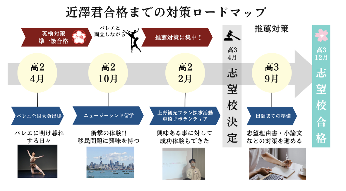 面談では当時の担当者の方から「近澤くんの経験なら推薦入試で挑戦できるよ!」と告げられました。正直疑っていましたが、実際にスポーツやバレエで合格した志望理由書をいくつか見せていただき、驚愕しました。